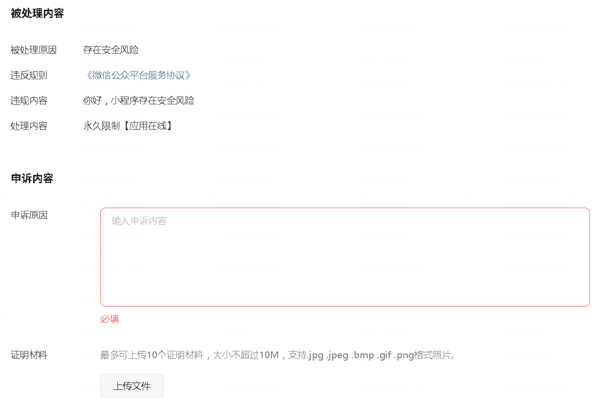 你好,因无具体账号id无法核实,请提供具体appid以便核实,你也可以登录微信公众平台查看站内信,根据指引内容进行排查,确保最新版本审核通过且发布完成后,再发起申诉,感谢反馈。
