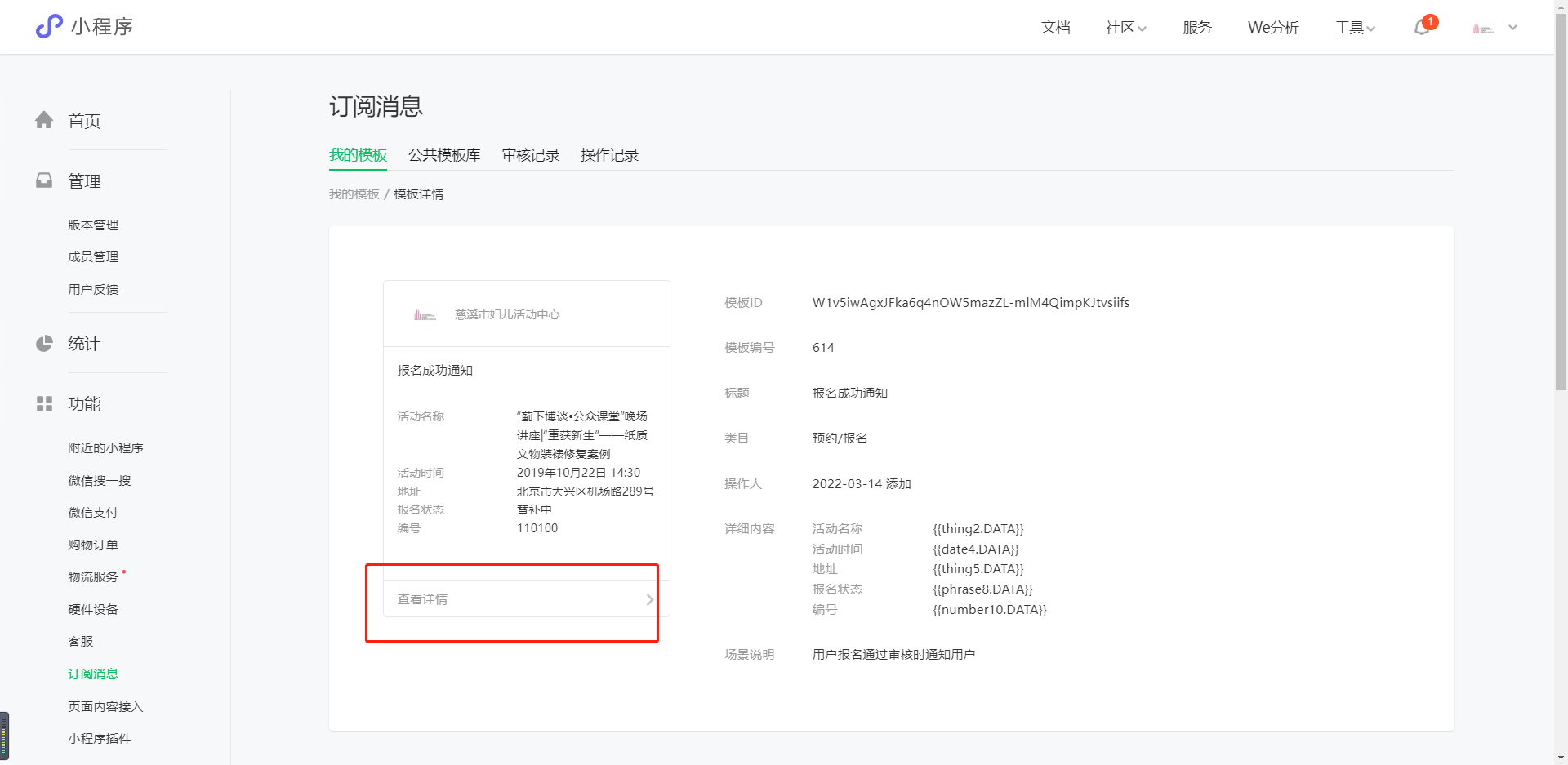 如图,我在我的模板里可以看到模板里有查看详情部分,但是我发出来的订阅消息确没有查看详情的部分。