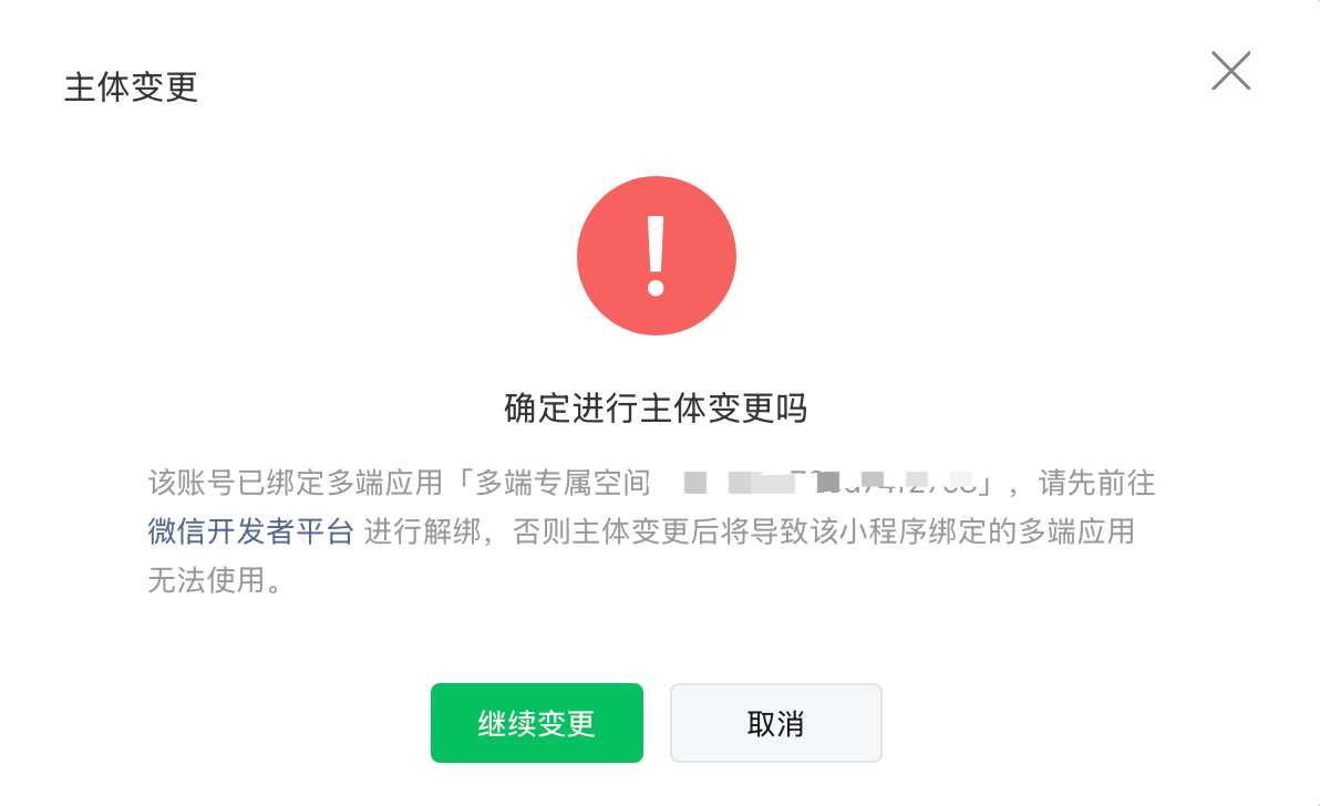小程序在变更主体时提示:“该账号已绑定多端应用「多端专属空间-xxxxxxxx」,请先前往 微信开发者平台 进行解绑,否则主体变更后将导致该小程序绑定的多端应用无法使用。”