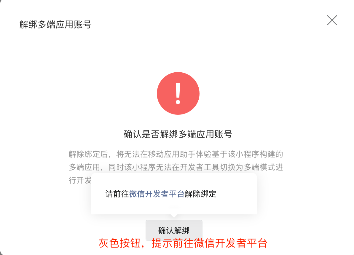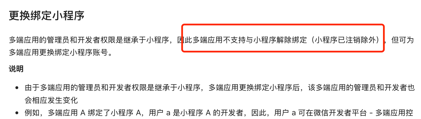 我找遍了开发者平台的每个角落,没有任何解绑入口。开始查阅开发文档。文档中注明了微信小程序不能解绑多端应用。