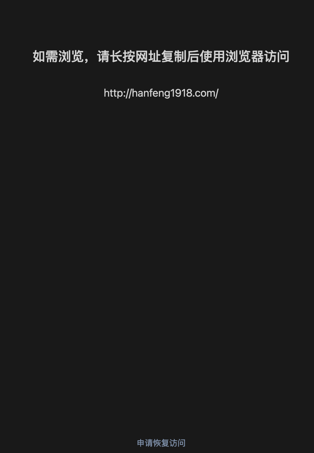 http://hanfeng1918.com,域名并未违规,但是在微信内无法直接访问,需要能恢复直接访问