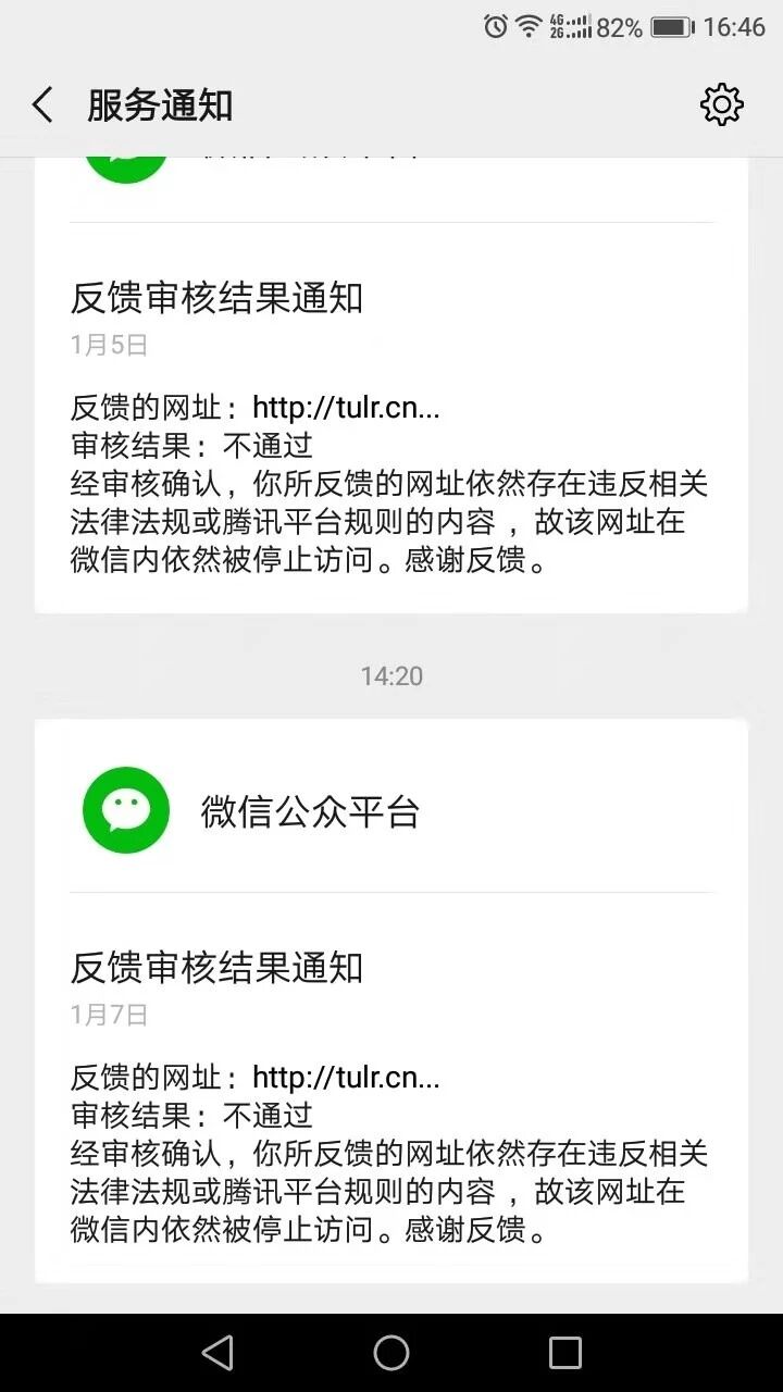 您好,在域名市场新购买的域名 tulr.cn,被微信拦截,通过微信客服指引,申请了两次恢复访问,但是反馈审核结果都是:不通过。