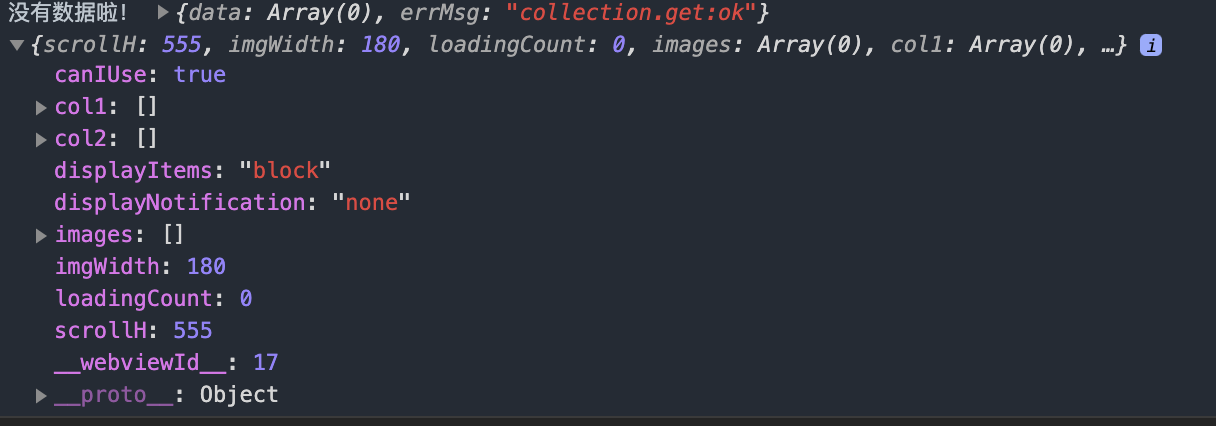 db.collection('items').skip(this.data.loadingCount).limit(10).get({// success:res => { images = res.data; if(images.length==0){ console.log("没有数据啦!",res,this.data); return; } console.log("数据库数据", images); }}) |
