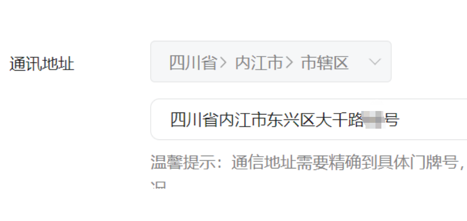 通讯地址选择的区级需与填写的区级一致