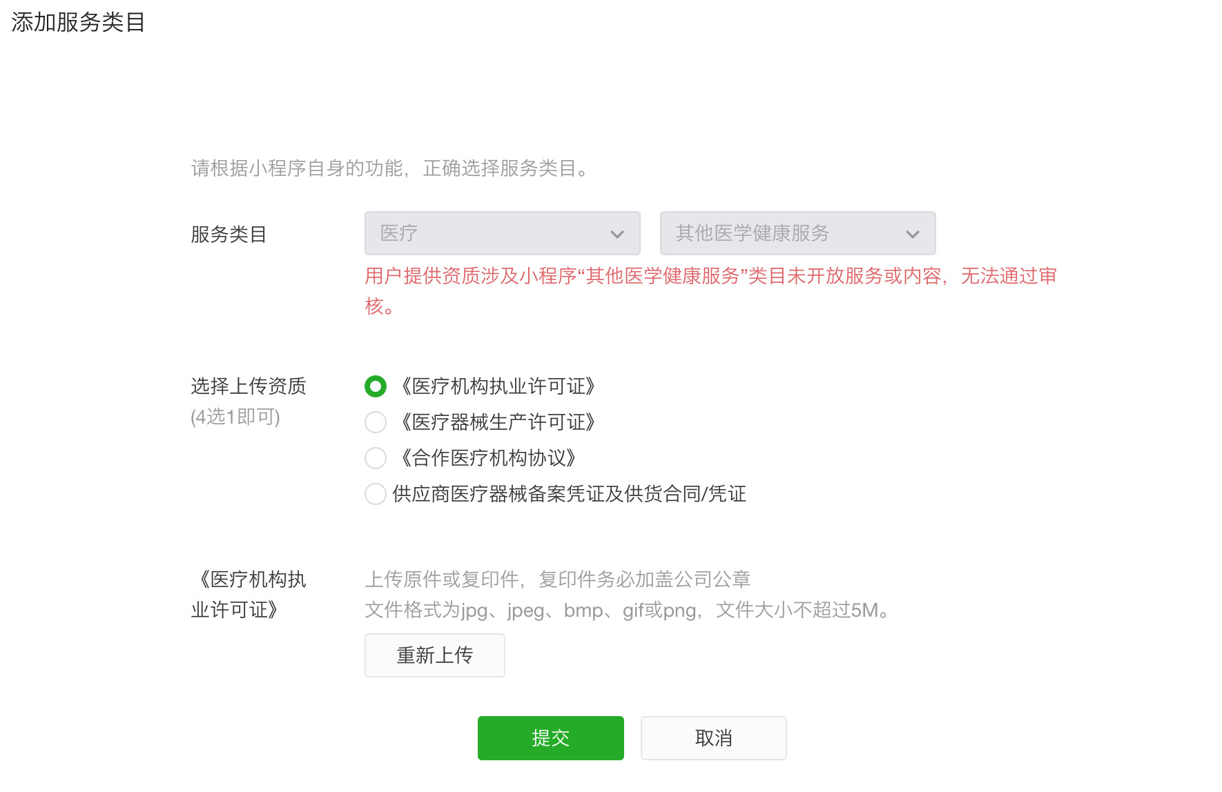 请问:「用户提供资质涉及小程序“其他医学健康服务”类目未开放服务或内容,无法通过审核。」,类目未开放服务或内容是什么意思?不开放这个类目给我们新增吗?如果是的话,那为什么叫我们要补充这个服务类目呢?有点自相矛盾哦?如果不是,那为什么又没有审核通过呢?