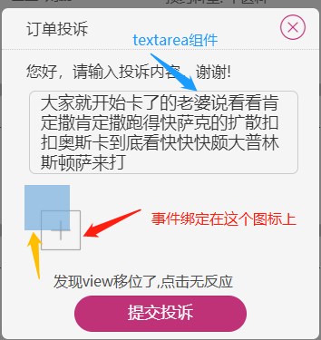 如图中,在模态框里用了一个textarea组件,最大长度是150,然后它下面是个上传截图的图标,上传事件绑定在图标上,发现当textarea输入一定字数后(图中是150),点击上传无反应,查看发现view移位了,view原本的位置应该在图一,大佬解答一下为啥会这样,有没有好的解决办法.