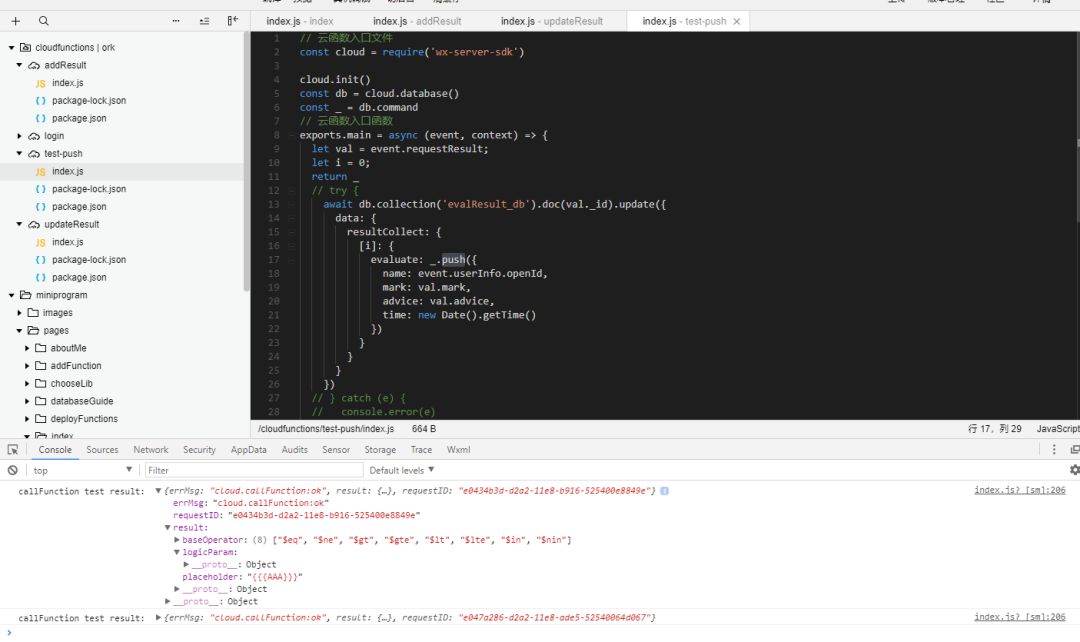 我在普通函数里的执行这个更新方法是没有问题的,但是在云函数里会出现以下报错,总是说方法无效,后来我return 了一下db.command,发现这个对象里并没有push方法(如上图所示),为什么在普通函数里这个对象返回值会有push,pop等方法,但是云函数没有呢,但是官方文档并没有说明这点,请教一下是怎么回事?
