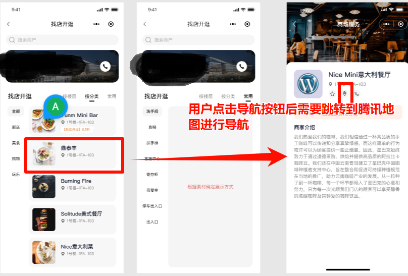 1.当前业务涉及新建店铺->用户导航到店铺的功能,用户需要在店铺详情页里导航到该店铺(调用wx.openLocation)。