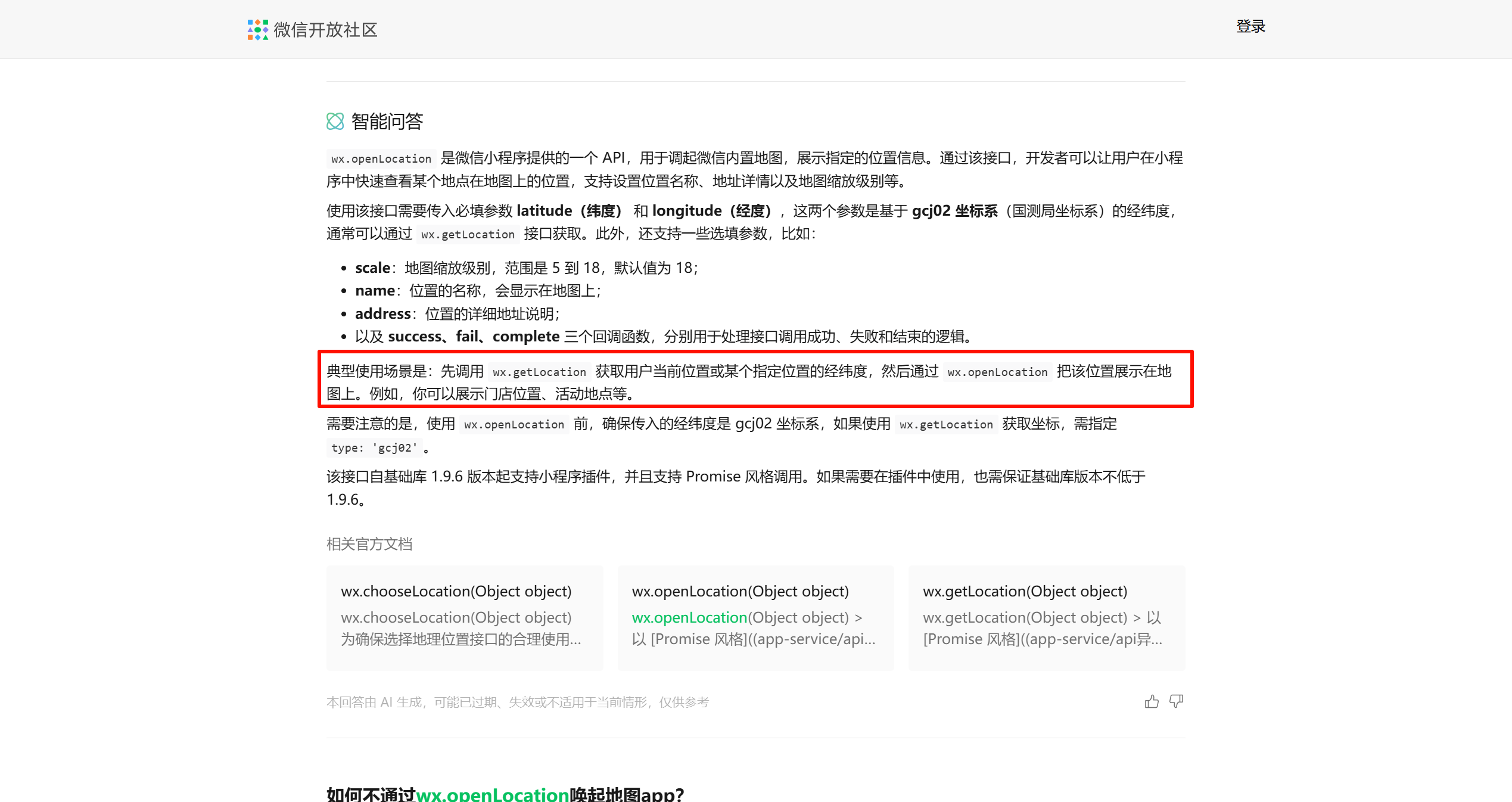 3.所以结论:我们需要调用wx.openLocation,但是需要申请wx.getLocation的接口权限。