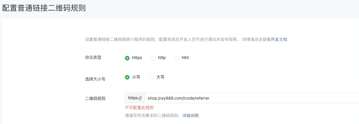 申请解封通过之后就可以正常配置这个扫普通码跳转到小程序的链接了