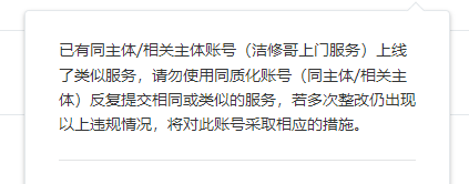 你好,经过查询提交的账号与深圳洁修哥服务科技有限公司是有相关联系的,这种情况是不能提交同类型的服务,建议在一个账号进行提交即可~
