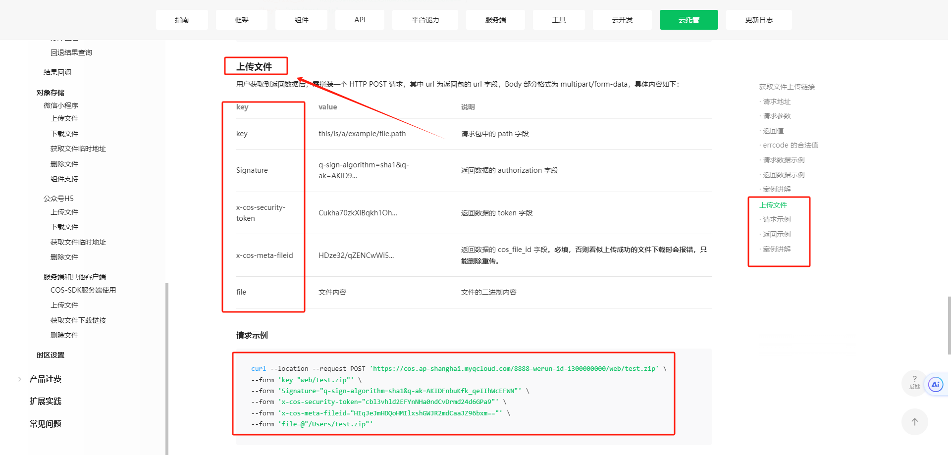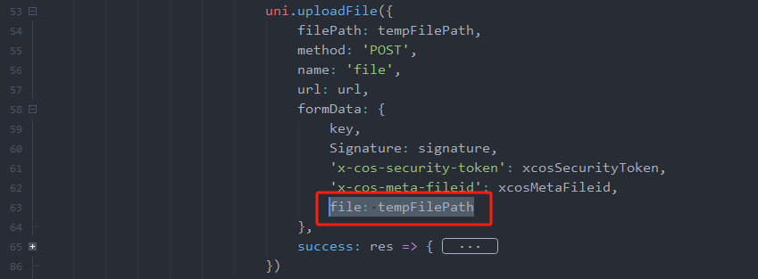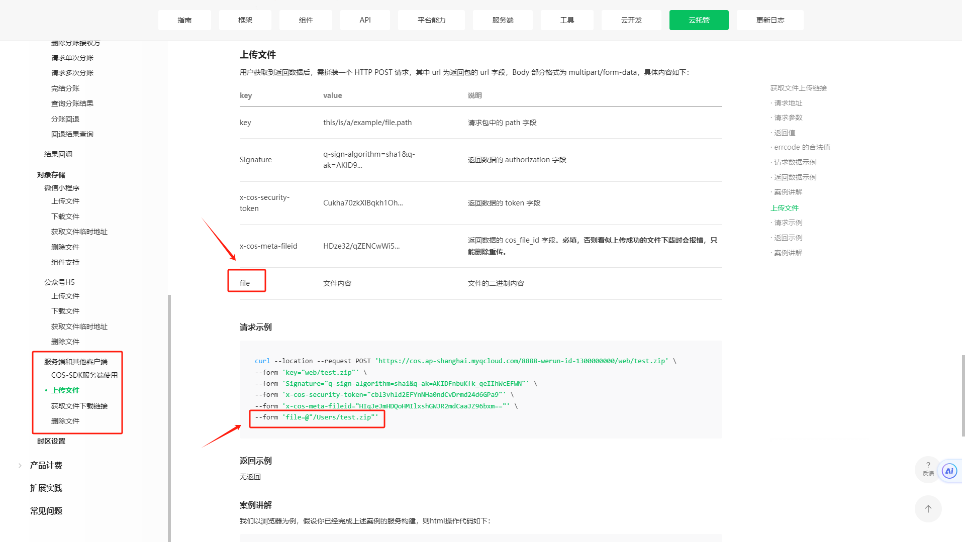 2、上传文件(小程序端 根据1返回的结果 封装好参数 发起post请求,直接请求腾讯云,把文件上传至腾讯云)