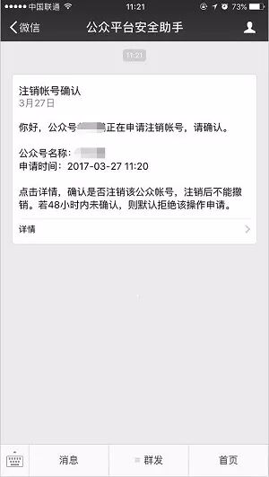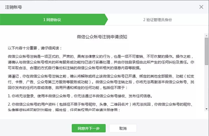 1、入口:公众号设置->原始ID->注销帐号,点击后即可进入。