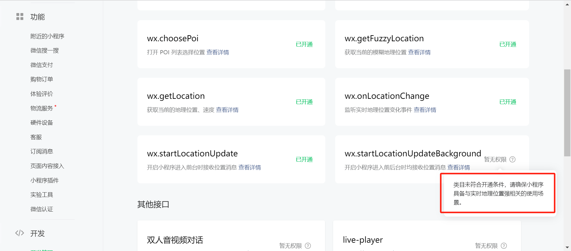 请问一下小程序的wx.startLocationUpdateBackground接口要怎样才能开通呢?目前说类目不符合