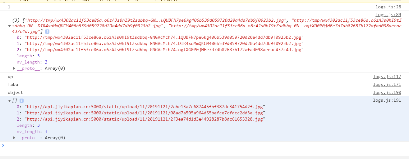 大致需求是将一组图片上传后然后返回在服务器的地址,发布时存入数据库console.log(typeof this.data.imagexlist)console.log(this.data.imagexlist[0])以上是取值代码var resp = JSON.parse(res.data);imagex.push(resp.url);page.setData({imagexlist:imagex})以上是生成代码
