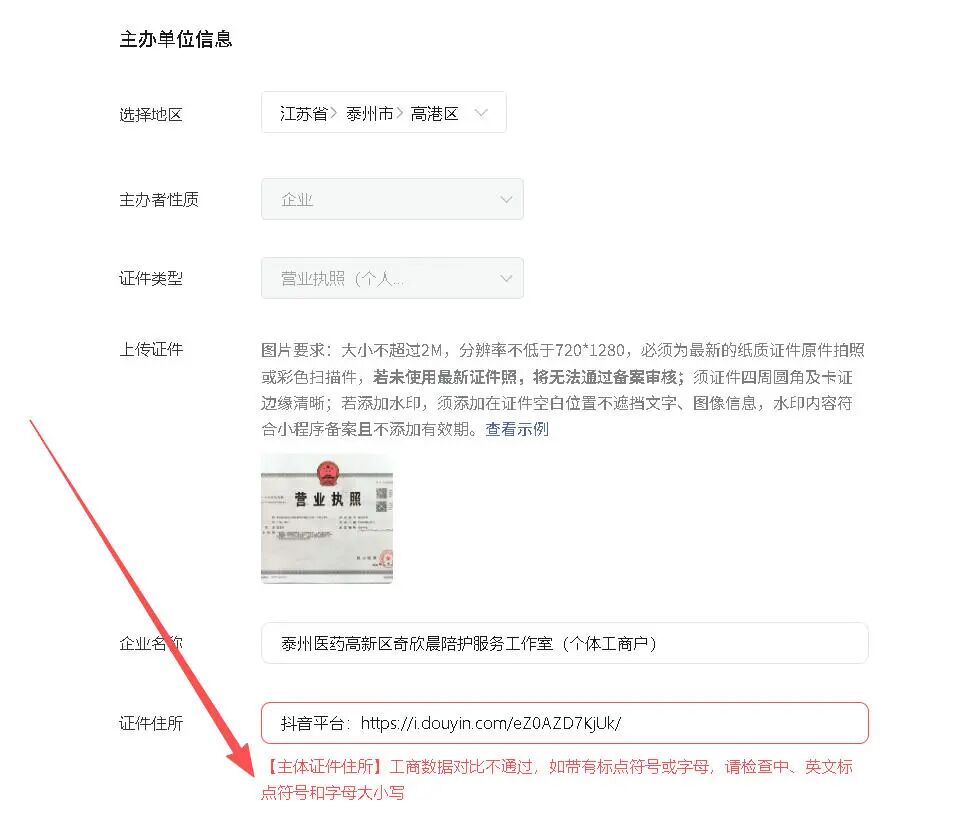 【主体证件住所】工商数据对比不通过,如带有标点符号或字母,请检查中、英文标点符号和字母大小写?