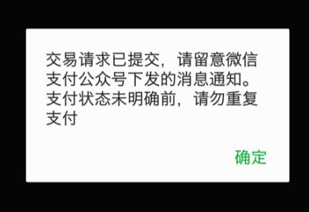 过段时间,再次支付该笔订单显示:交易请求已提交,请留意微信支付公众号下发的消息通知。支付状态未明确前,请勿重复支付