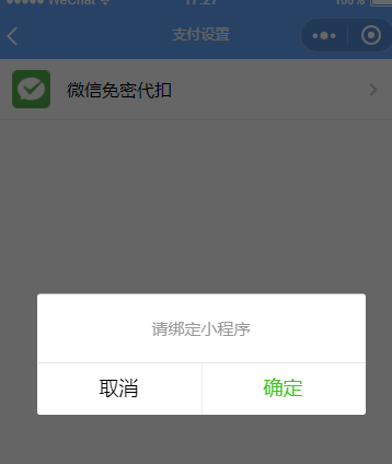 在点击免密代扣授权时,调用了navigator 组件,跳转官方签约页面,但是点击提示请绑定小程序,如果这个跳转只允许跳转在同一公众号下的小程序的话,这个签约页面的小程序是你们官方的,我申请绑定怎么也不审核?如果不需要申请绑定的话,那我是在配置免密代扣时,那边有问题?麻烦给个详细的解答 ,谢谢 困扰一天了、