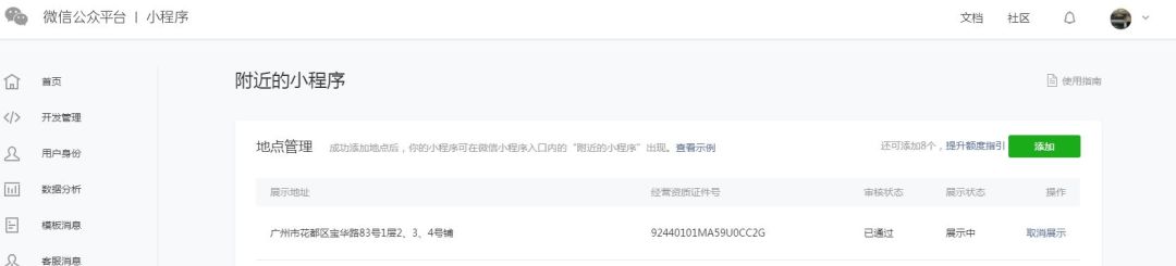 小程序代码发布成功,微信公众平台附近小程序审核通过展示中,但是附近的小程序就是不显示,也已经删除过重新审核,但是还是无法展示