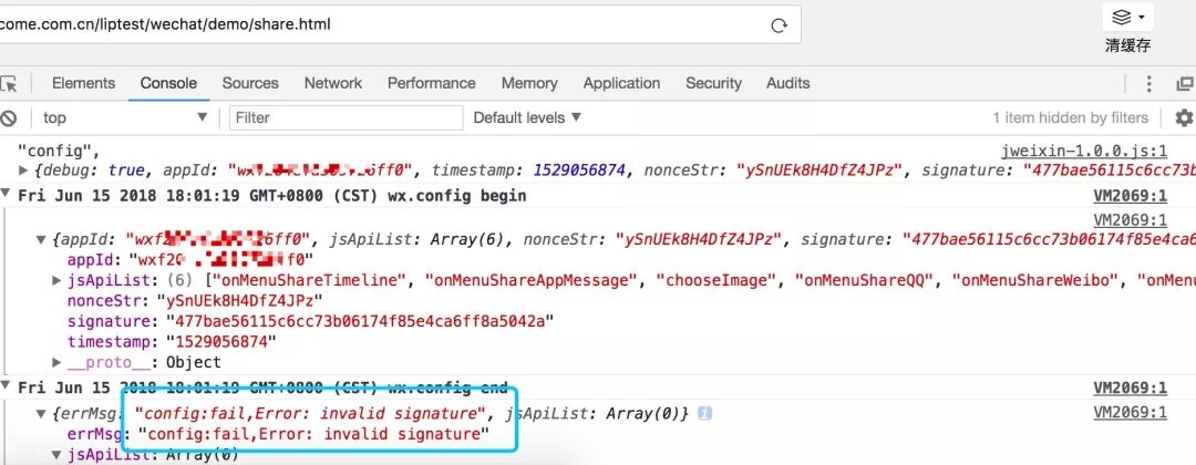 我又试了一下用公众好的appid,在小程序外访问好用,但是放在小程序里还是会报错 invalid signature。