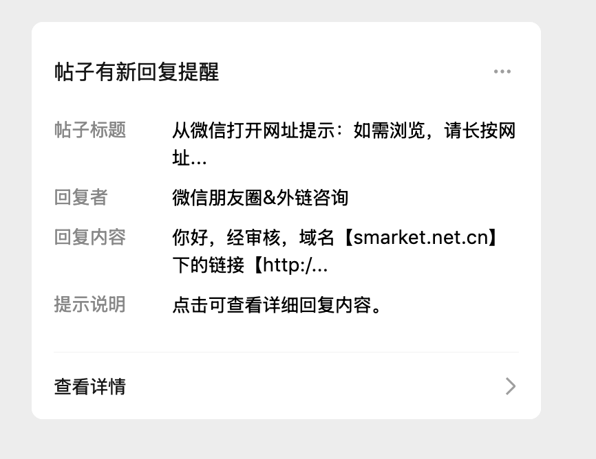 你好,经审核,域名smarket.net.cn 下的链接【 http://uat-contents.smarket.net.cn/webczlcloud/8123b1202af0480693874260558d3cd4?bucket=AD7moGmxTTGi】【http://uat-file.smarket.net.cn/project2018/e10a9846f2f44e7c91c5c362a02897e7?bucket=c23RMzqc2uMH】等的内容存在违反《微信外部链接内容管理规范》的第18条“色情类内容”,请修改违规内容并修复安全漏洞后进行申诉;申诉方式可点击停止访问页底部入口进行操作,我们会在三个工作日处理,请耐心等待。 详细规则请参考《微信外部链接内容管理规范》http://weixin.qq.com/cgi-bin/readtemplate?t=weixin_external_links_content_management_specification