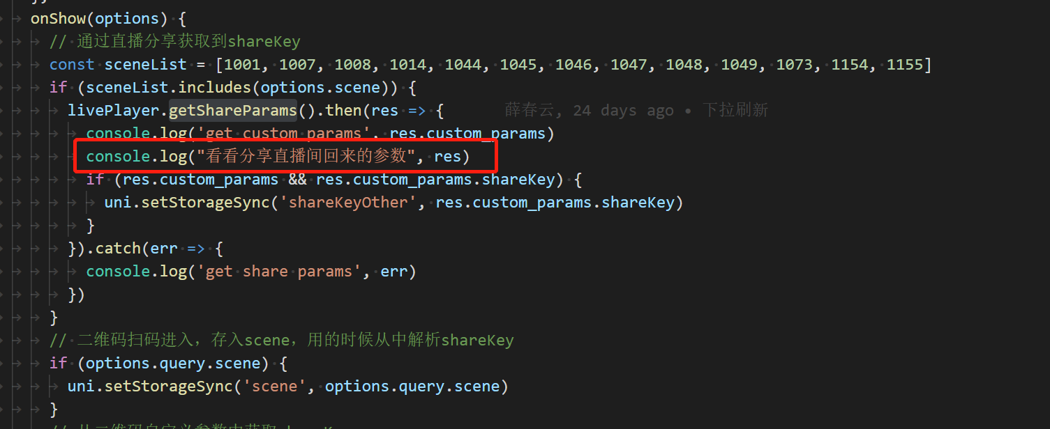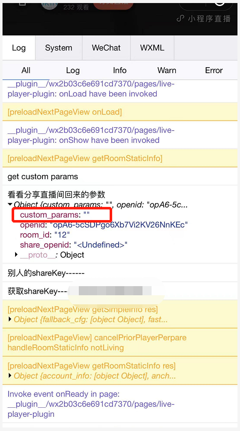 使用上面服务端API返回的字段【cdnUrl】生成直播间分享二维码,扫秒二维码 -> APP onsShow中 livePlayer.getShareParams()获取不到res.custom_params