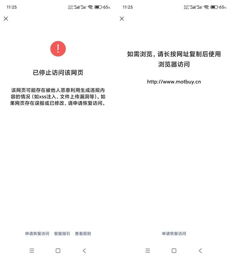 如图,图左为kexuny.cn打开提示有注入篡改,核实并没有被修改,页面仅为官网业务展示;图右同为同主题备案域名,为单一项目的介绍页,并无违规内容,但在微信中无法打开,十分影响用户体验和业务交流。通过拦截页申请恢复提交了很多次,每次都是提示三个工作日内通过过微信团队公众号回复审核情况,从来没有收到过核查信息,请专员帮助反馈核实,谢谢!以下附域名页面截图