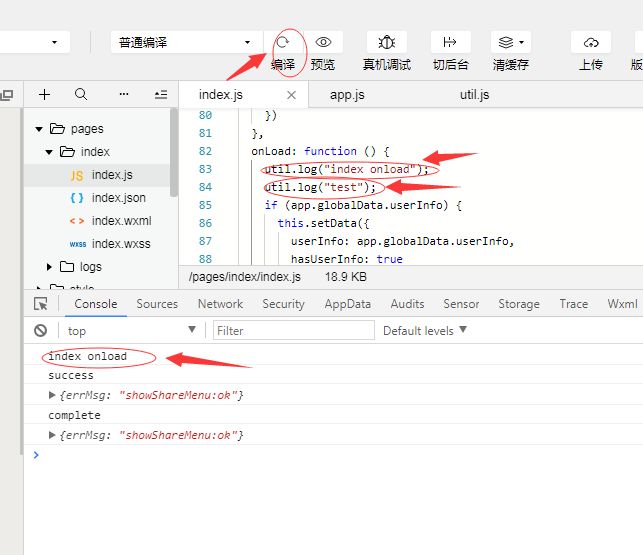 下面有两个输出,index onload 是之前的输出,test是新加的输出,然后点编译,下面的控制台,只有index onload,没有test输出,点击关闭开发工具,在重新点击运行开发工具才能看见test输出