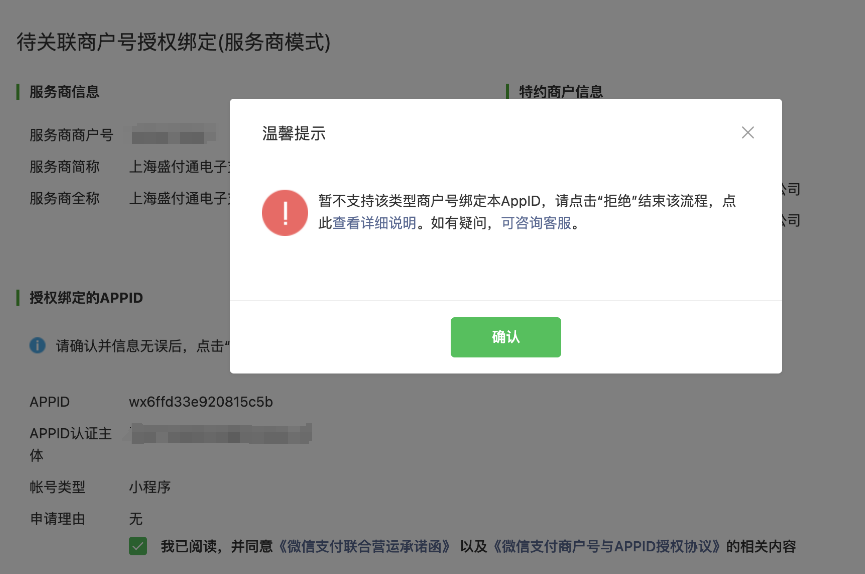 待关联商户号(服务商模式)(ApplD:wx6ffd33e920815c5b)点击确认,提示暂不支持该类型商户号绑定本ApplD。