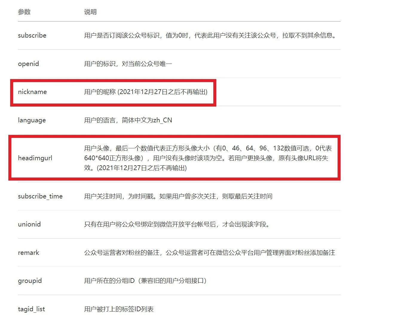 20年6月8日起,用户关注来源“微信广告(ADD_SCENE_WECHAT_ADVERTISEMENT)”从“其他(ADD_SCENE_OTHERS)”中拆分给出,2021年12月27日之后,不再输出头像、昵称信息