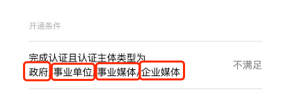 目前视频号服务菜单需要截图中这4种认证主体类型才能开通。