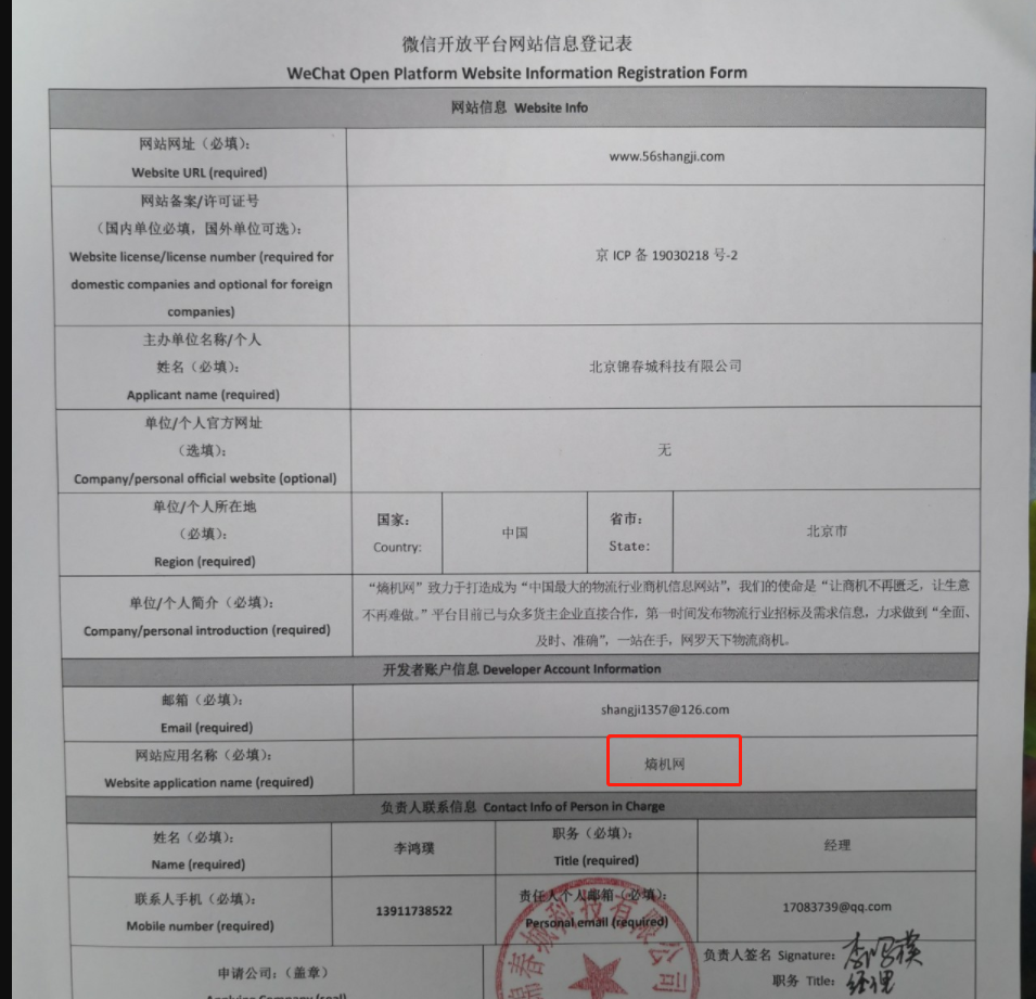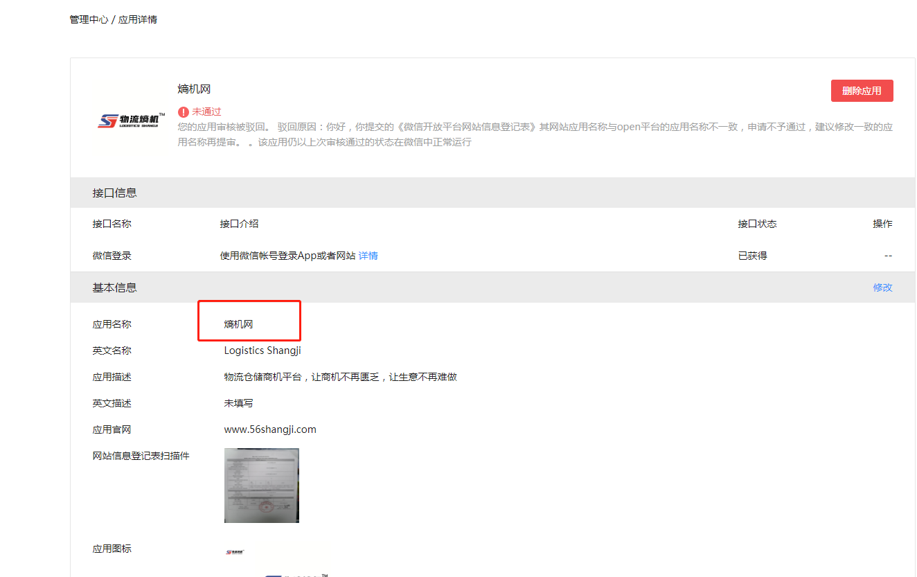 您的应用审核被驳回。 驳回原因:你好,你提交的《微信开放平台网站信息登记表》其网站应用名称与open平台的应用名称不一致,申请不予通过,建议修改一致的应用名称再提审