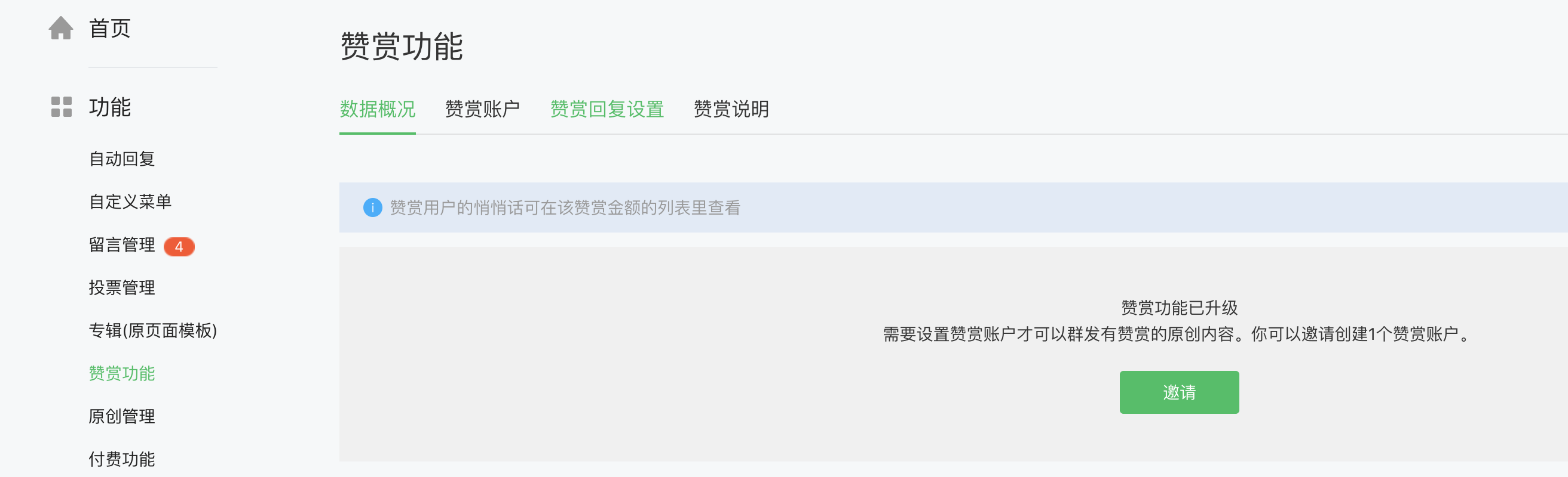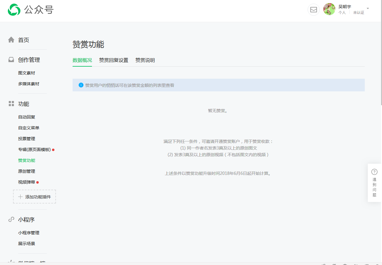 你好,平台规定2018年6月6号起,公众号每以同一作者名发表3篇或3篇以上的原创文章,即可邀请创建一个赞赏账户,请确认是否已符合要求。
