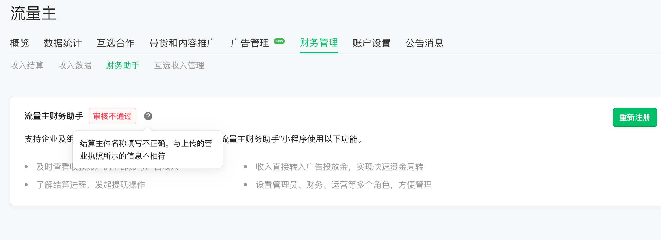 注册流量主财务助手审核不通过,显示结算主体名称填写不正确,与上传的营业执照所示的信息不相符,在哪里查看或者修改结算主体名称