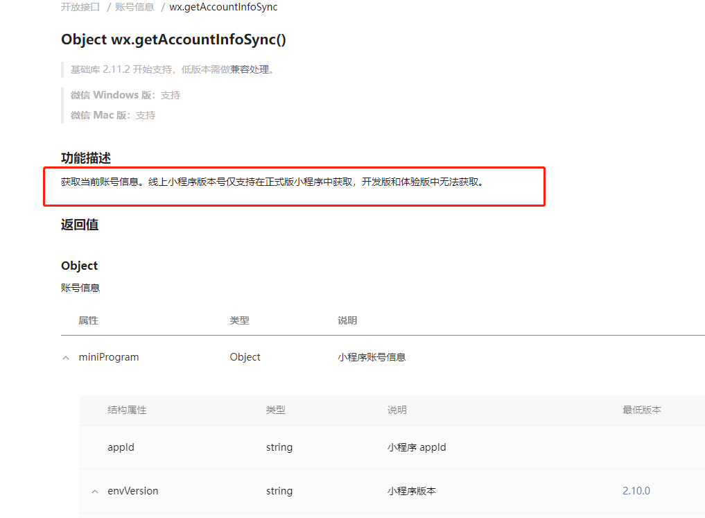 https://developers.weixin.qq.com/minigame/dev/api/open-api/account-info/wx.getAccountInfoSync.html#%E8%BF%94%E5%9B%9E%E5%80%BC