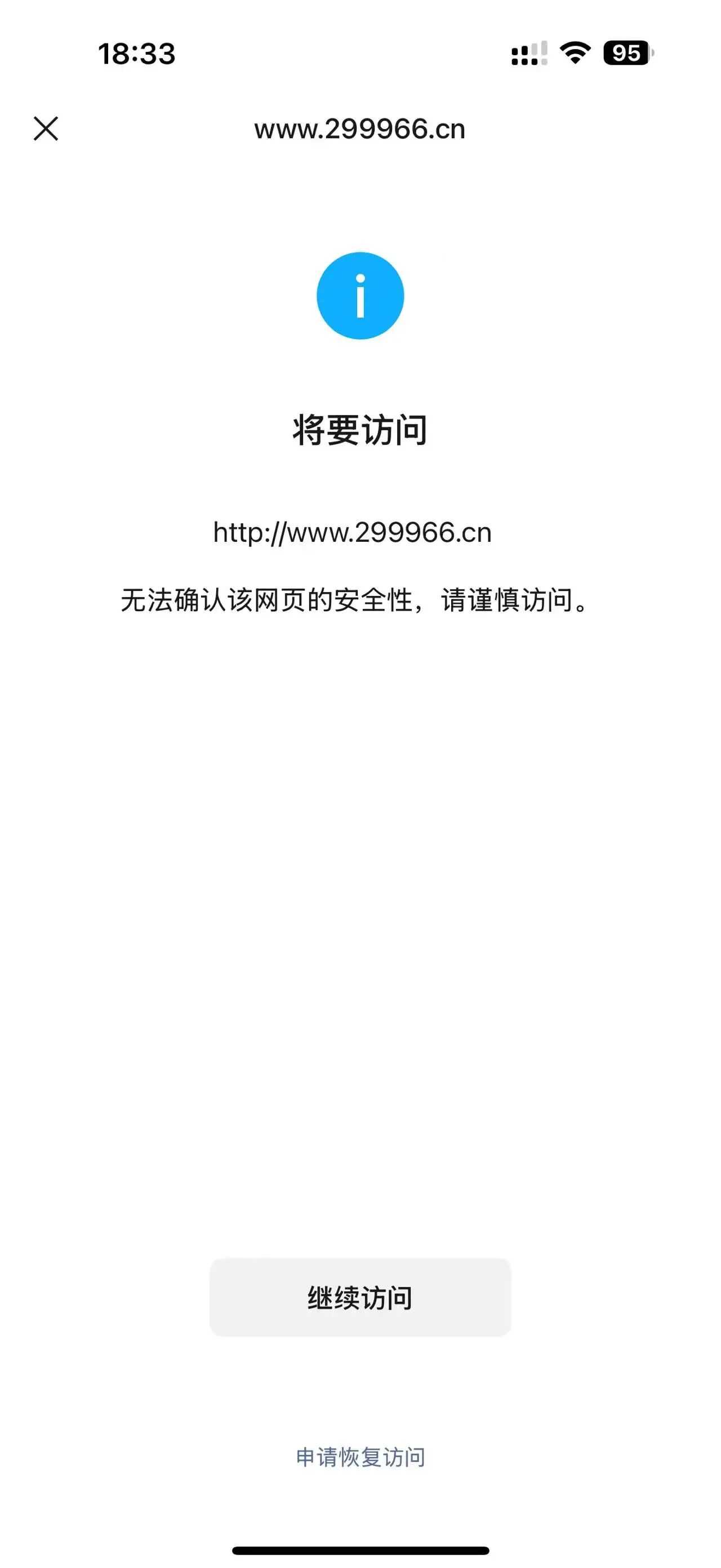 在微信里面访问我们网站:www.299966.cn 一直提示”非微信官方网页,请确认是否继续访问“,麻烦帮忙解决一下,相关信息如下:
