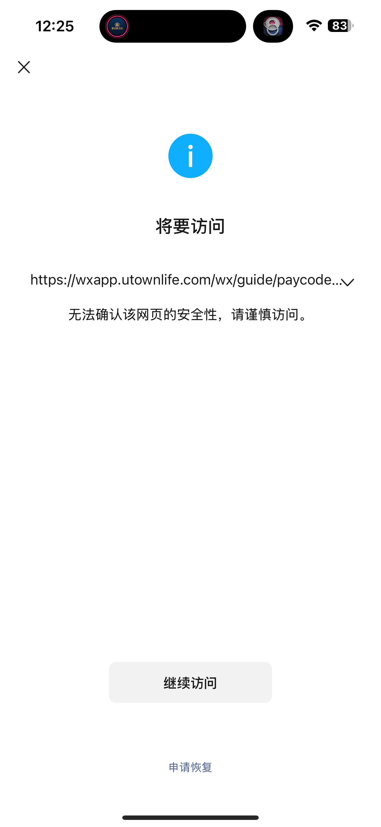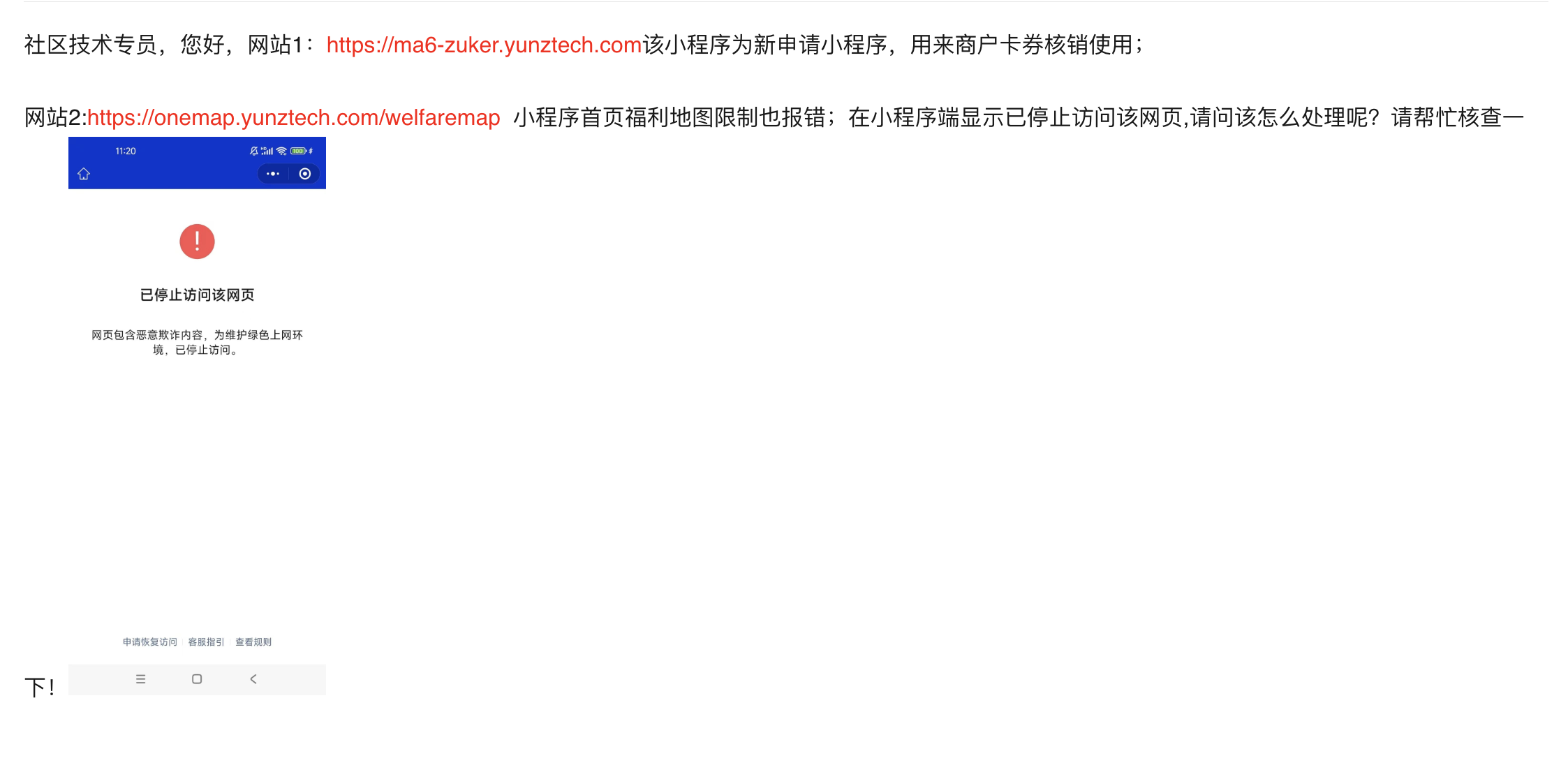 社区技术专员,您好,网站(https://wxapp.utownlife.com/wx/guide/paycode/100006527/code?id=kmUqD&rtChannel=quick),在微信和公众号里访问会提示 无法确认该网页安全性,谨慎访问,请问该怎么处理呢?请帮忙核查一下。
