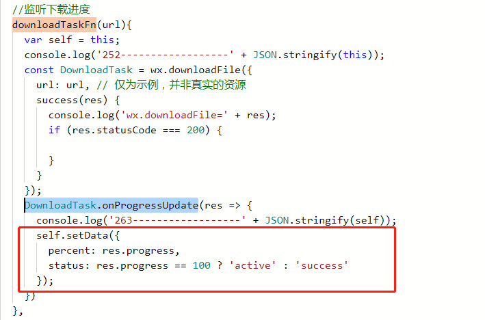 问题: 在 DownloadTask.onProgressUpdate 监控下载进度时,使用setData赋值不成功;