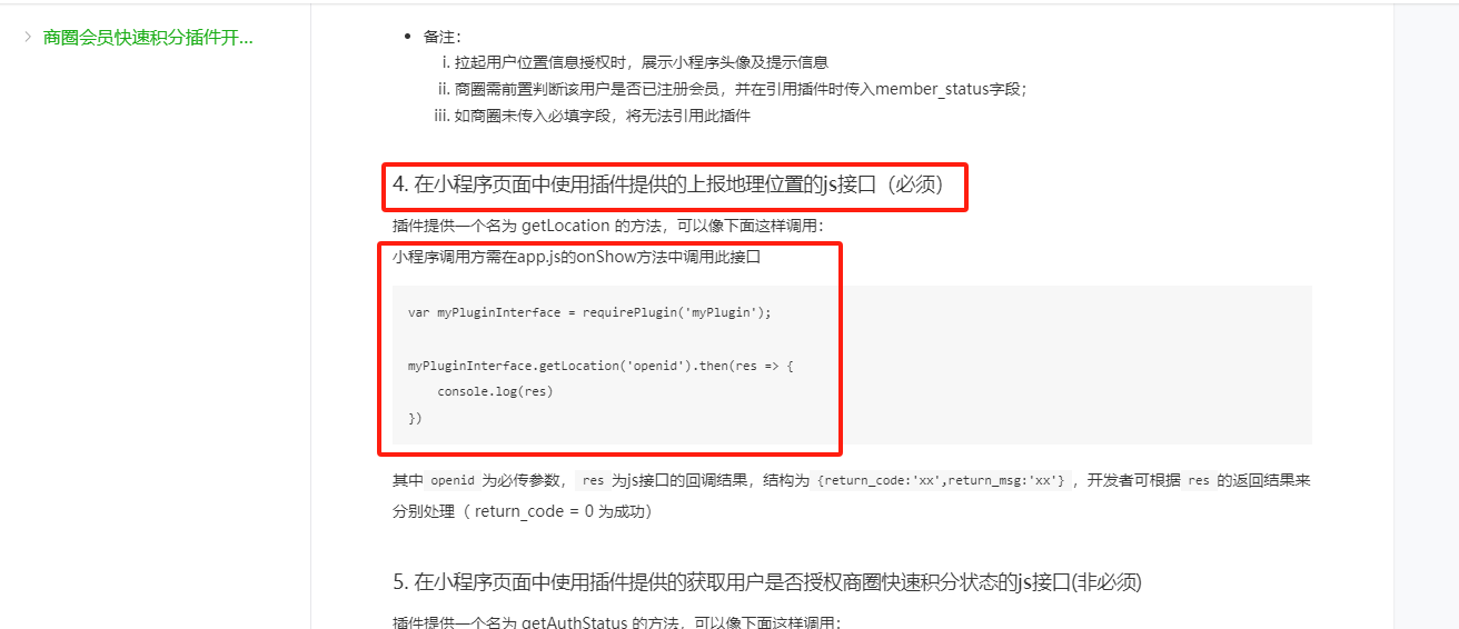 商圈会员快速积分插件的官方文档上表明:在小程序页面中使用插件提供的上报地理位置的js接口(必须),文档是在 app.js 的 onShow 事件中调用的,如下图: