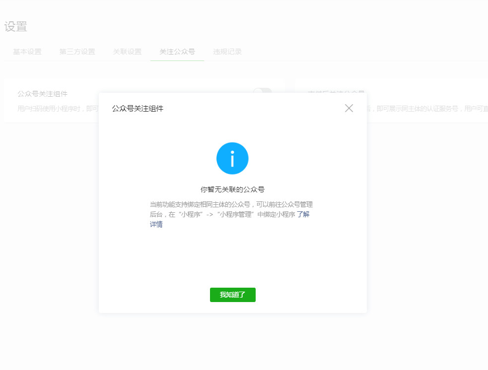 正常情况下应该能使用“公众号关注组件”,可是一直显示无关联。