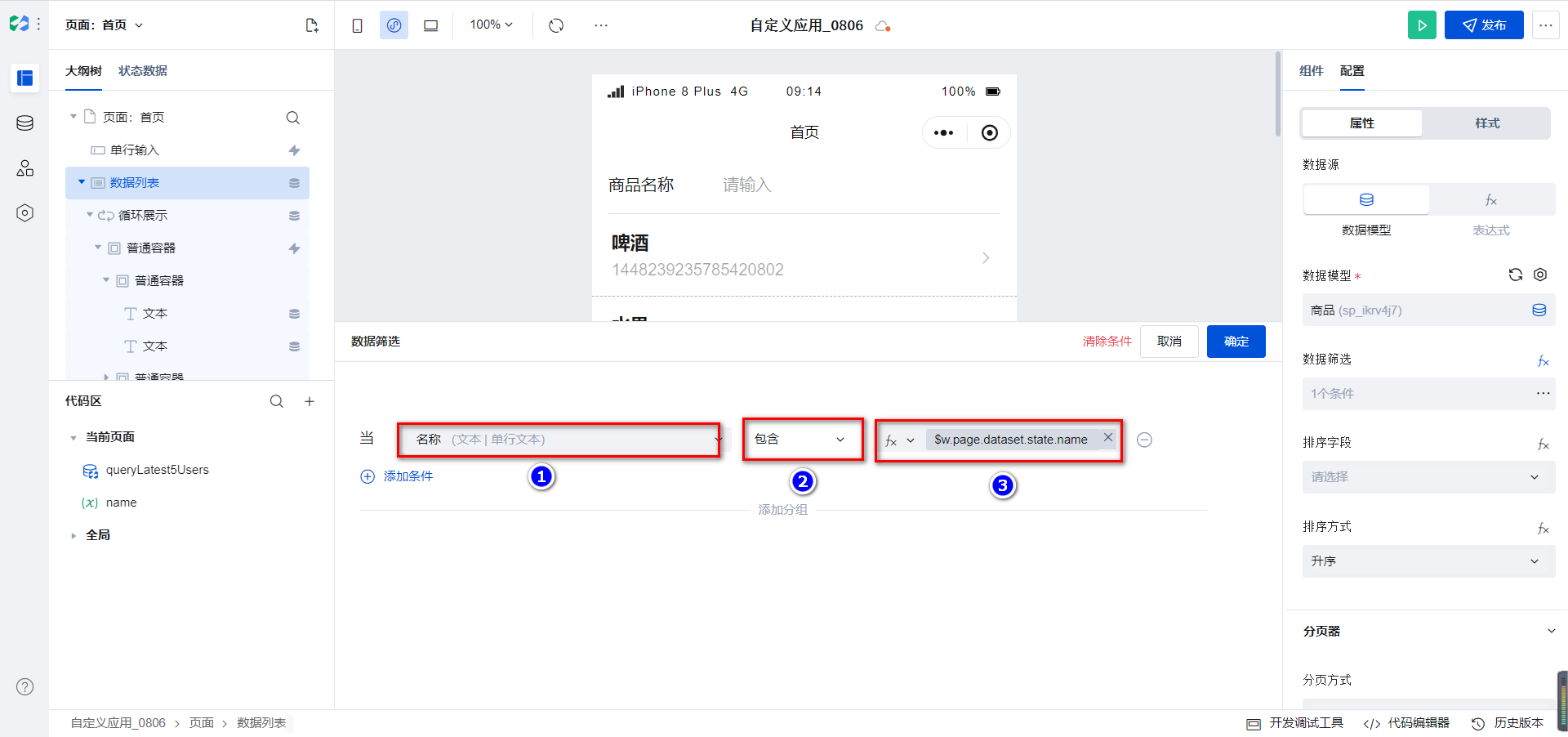 在数据列表组件,设置筛选条件,让你数据源的字段和变量进行比较,如果是模糊匹配可以选择包含,如果是等值比较可以设置为相等