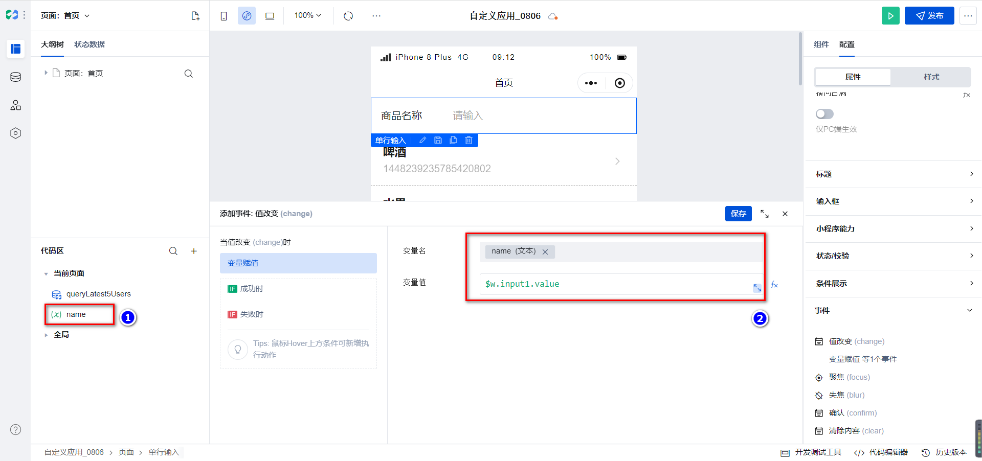 查询条件构造分为两步,先是创建变量,然后让对应的组件绑定值改变事件,将输入框的值赋值给变量