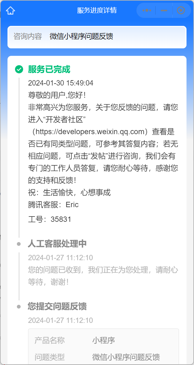 已在该社区发了两次帖子没人能帮助解决问题,到腾讯客服下人工客服工单寻求帮助,得到的解决方案是回社区继续发帖求助!