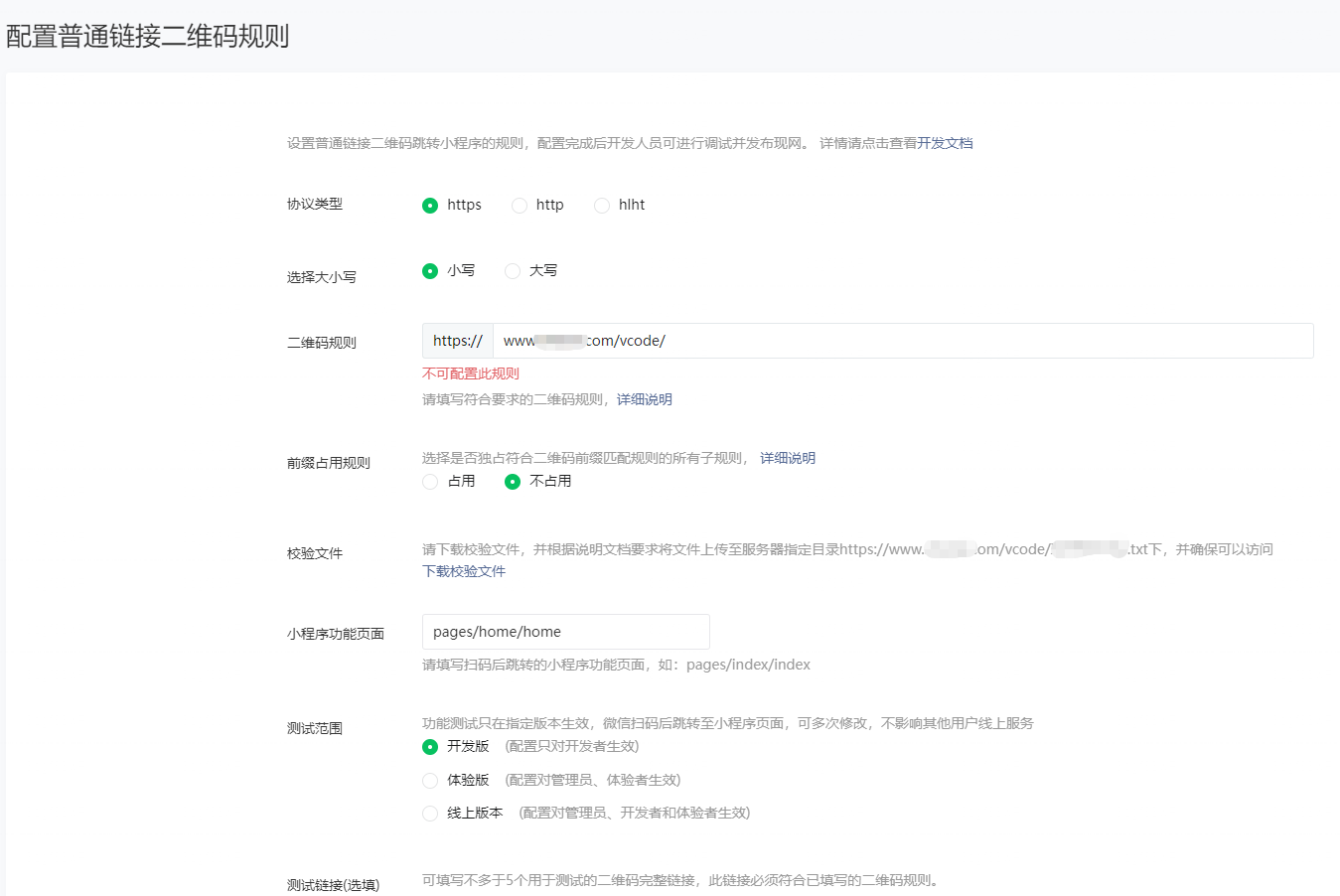 按照微信文档操作的,域名已ICP备案的,校验文件也可以正常访问,请问为什么一直报错:不可配置此规则。是有什么特别的前提么?