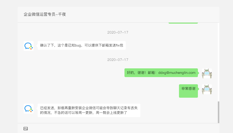 最后是 那个同事 卸载了 企业微信,重新安装了一遍,就正常了。但是过了几天,又有其他同事出现这种问题,我都是叫他们重装一下企业微信,但是这个不是根本的解决方法,这应该就是企业微信客户端的问题,麻烦你们排查一下