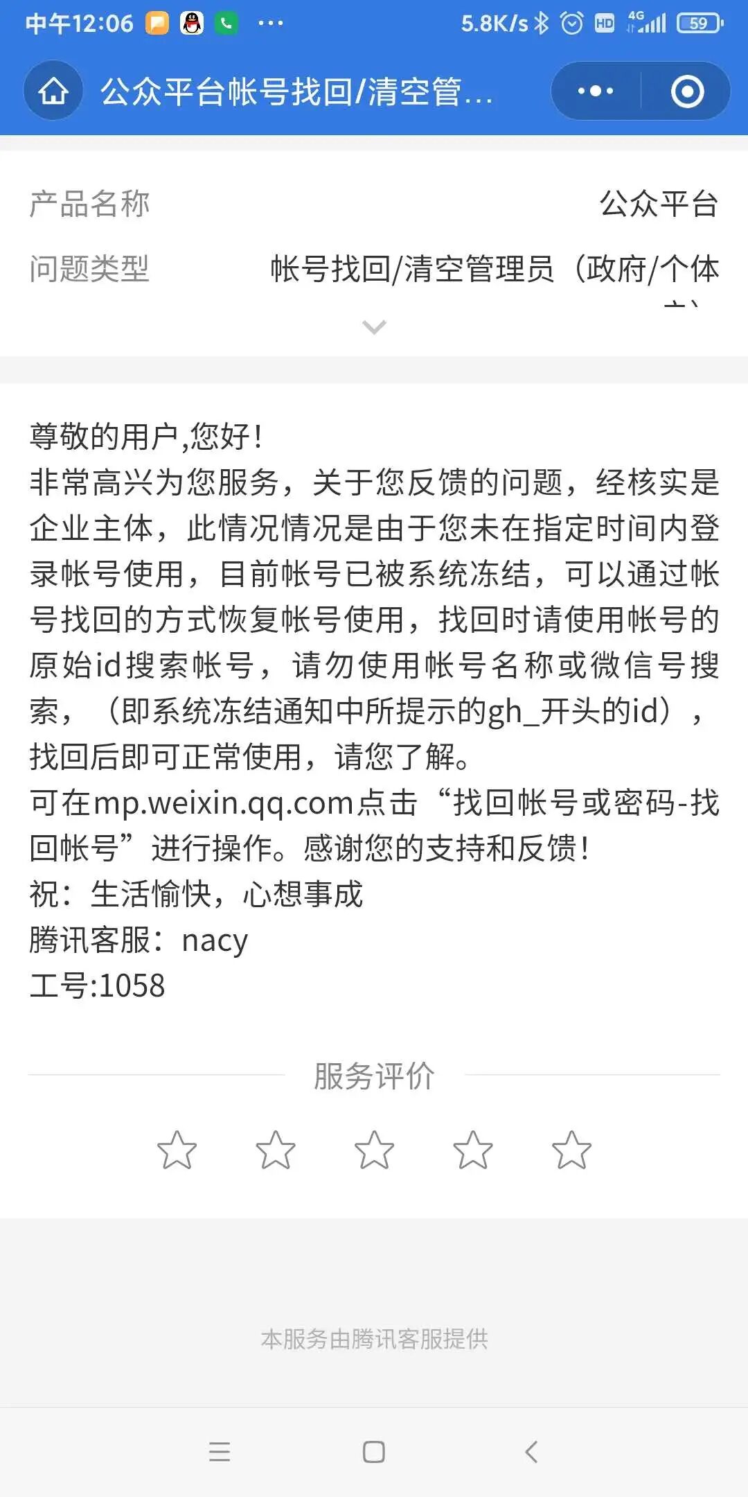 第一个问题:我的服务号注册了腾讯云的账号。在腾讯云每次登录都是使用微信公众号授权登录的。怎么会提示“微信公众号长时间未使用”。