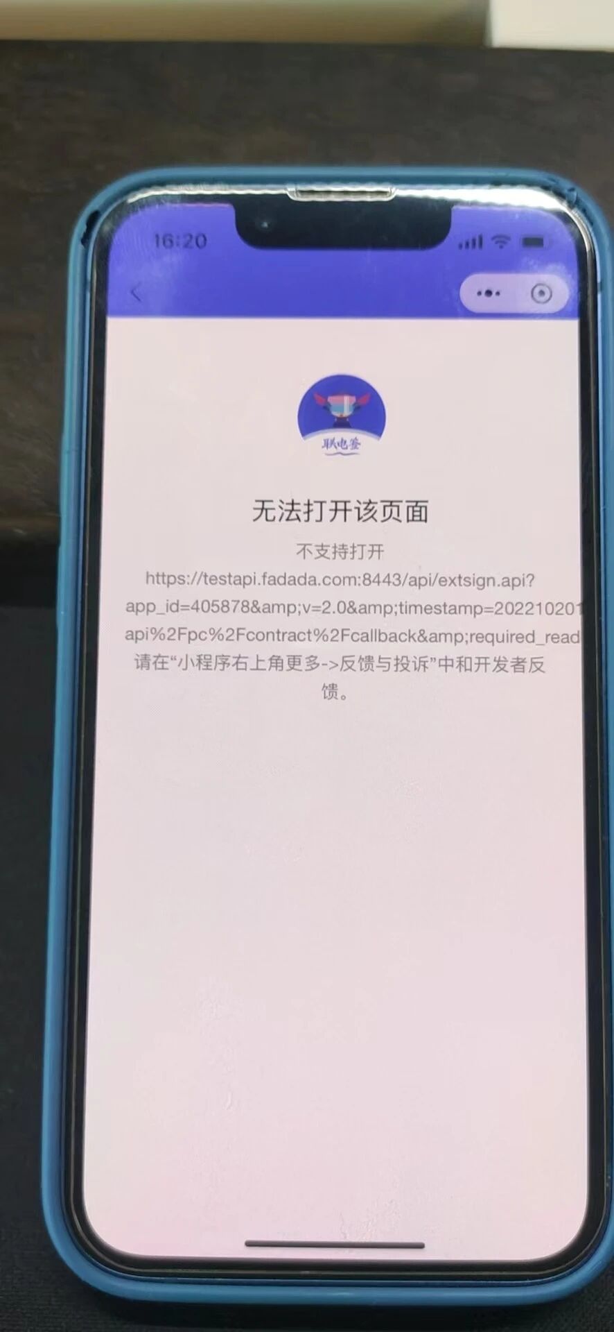 小程序无法打开此链接:https://testapi.fadada.com:8443/api/extsign.api?app_id=405878&v=2.0×tamp=20221020162135&transaction_id=1666254095418&customer_id=97B7F9C6788E40803E817A50D53C09E4&contract_id=1666076294232&doc_title=123&keyword_strategy=0&position_type=0&sign_verify_way=10&verify_way_flag=1¬ify_url=https%3A%2F%2Fdev.lskiot.cn%2Fv2%2Fportal-api%2Fpc%2Fcontract%2Fcallback&required_read=1&msg_digest=MzhFODA3MUFFRUM0OTUxOUM5RDc3QTUxNDE2NjA0RkQzN0E2NjYyRg==