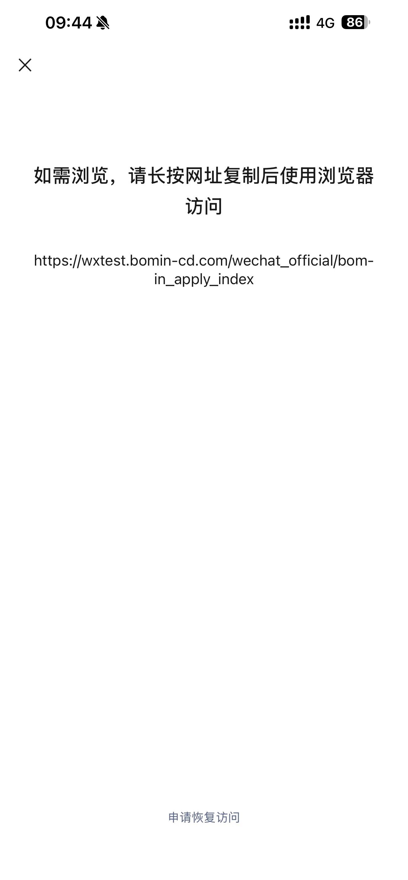 测试公众号菜单地址 :https://wxtest.bomin-cd.com/wechat_official/bomin_apply_index 点击菜单访问 显示 如需浏览,请长按网址复制后使用浏览器访问,能否给恢复下