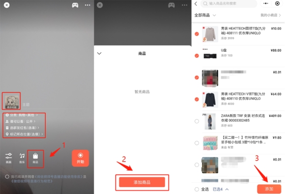关联完成后,回到视频号页面,点击开始直播,设置直播封面(比例6:7),分类,谁可以看等等,还可以勾选群发红包,群内的小伙伴领取红包时即可进入直播间,点击【商品】-【添加商品】,勾选您要添加到直播间的商品,点击【添加】;