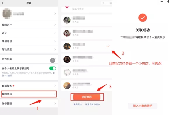从手机微信端进入视频号设置界面,点击【我的商店】,选择您的小商店进行关联,目前仅可关联一个,关联后可以进行更换;